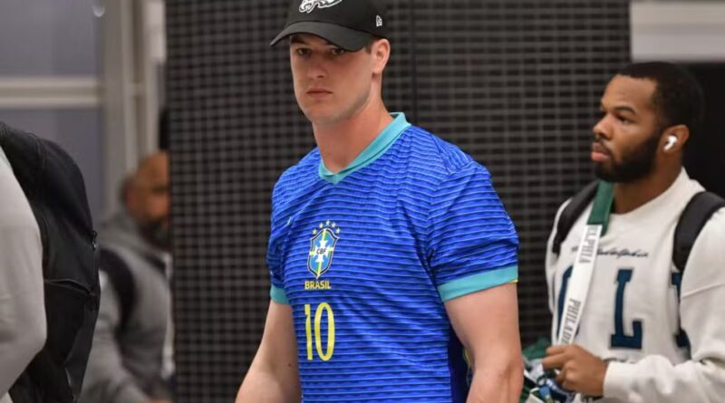 Tanner McKee, jogador do Philadelphia Eagles na NFL, não tem ascendência brasileira, mas decidiu incluir a bandeira do Brasil em